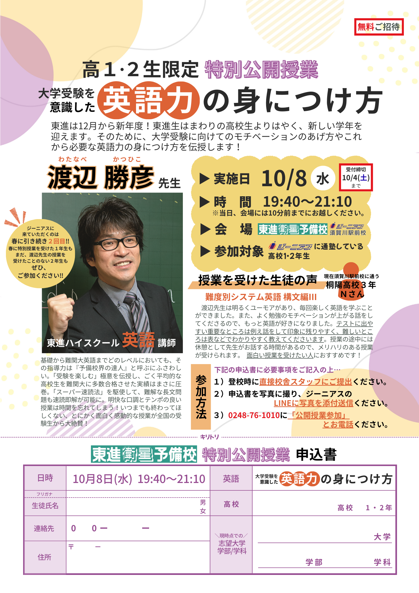 渡辺勝彦先生の特別公開授業がいよいよ来週10/8(水)に実施となります!